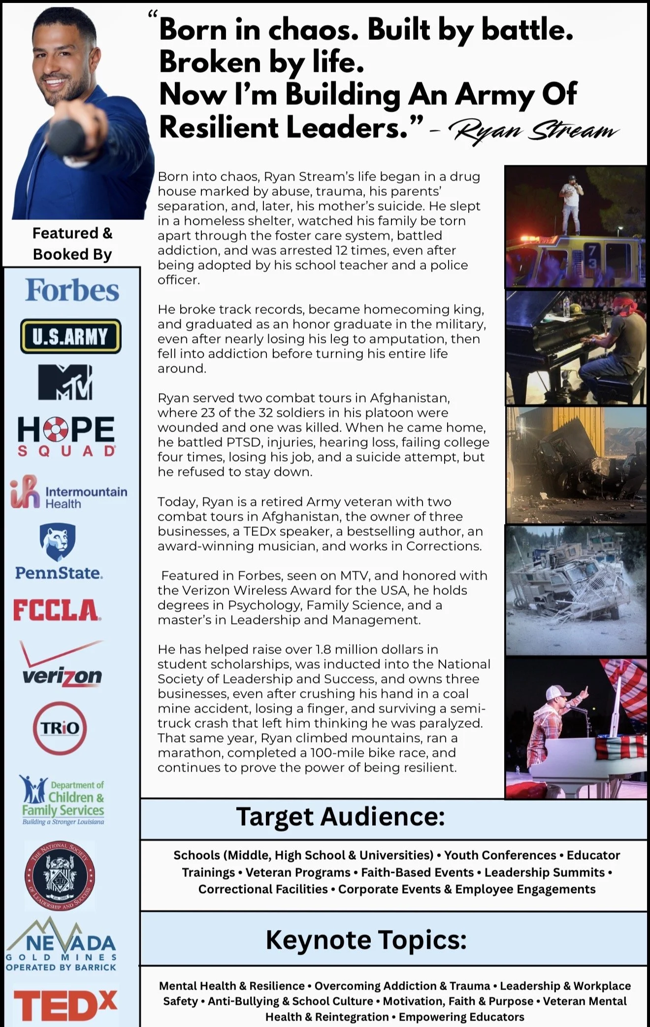 "From foster care, drugs, and war zones, Ryan Stream conquered the battles within himself. Learn how he triumphed both before and after adoption into a new family and through wartime experiences."
